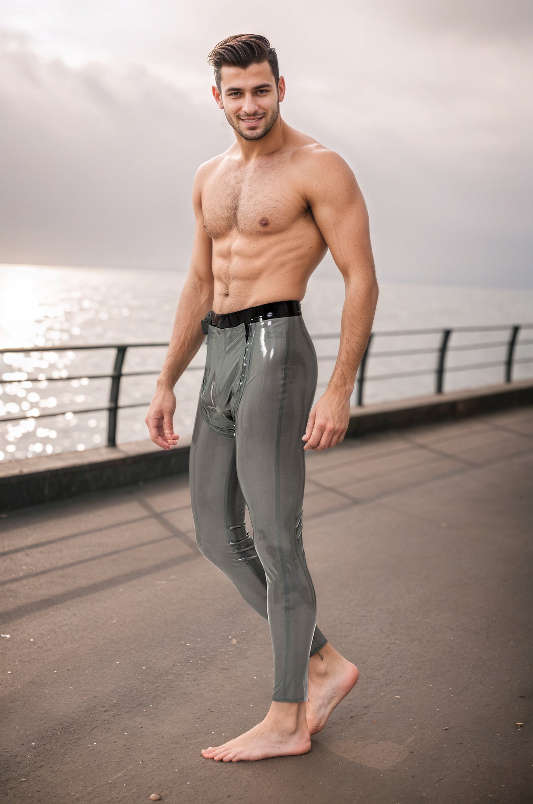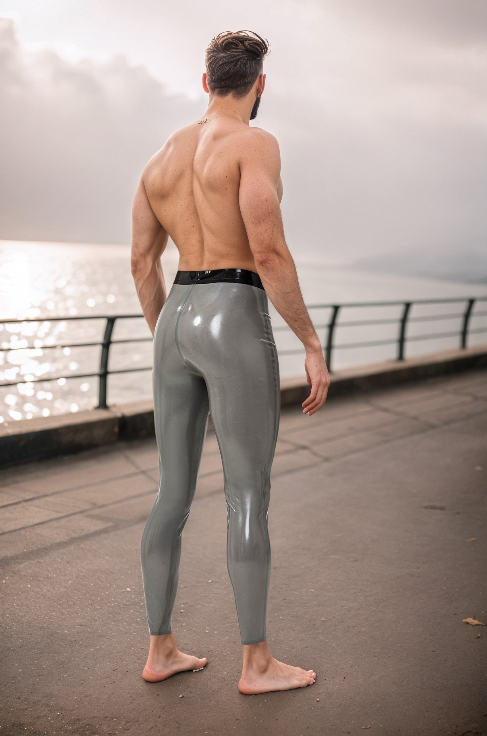 Color and Material: The garment is made from high-gloss latex in a Metallic Pewter shade, giving it a highly reflective, medium-to-deep gray appearance that closely follows the contours of the legs and hips.