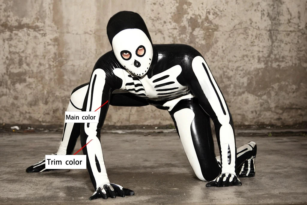 The Luster of the Void Crafted from 100% premium natural latex, the Obsidian Black base provides a deep, mirror-like shine. The Ghost White graphics reflect light with high intensity, making the skeletal frame appear to glow under UV light or professional studio strobes.