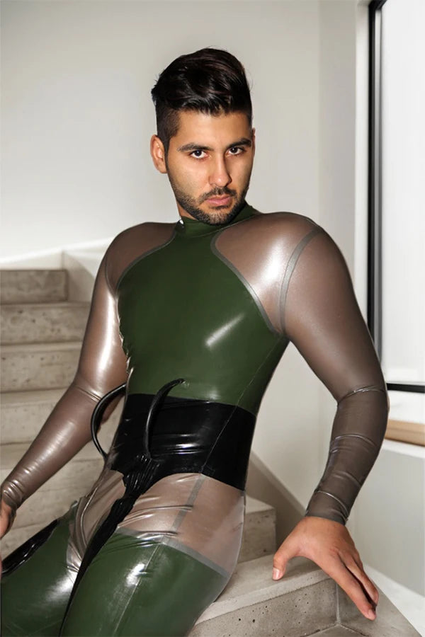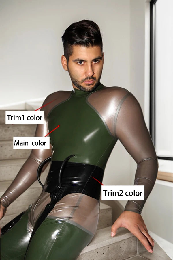 The Luster of Military Tech The 100% natural latex provides a mirrored "wet-look" finish. The Olive Green takes on a coated-armor texture, while the Metallic Pewter reflects light with a cold, stainless-steel brilliance. This interaction between colors makes the suit appear multidimensional and reactive to movement.