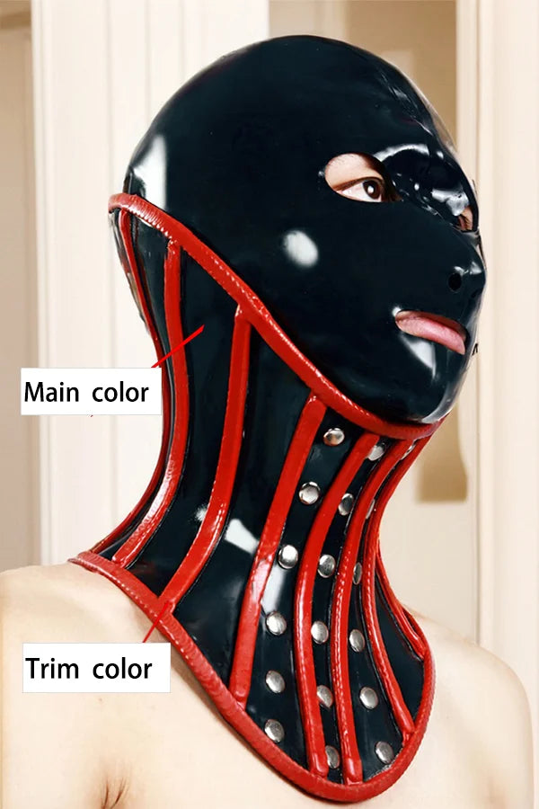 Two-Piece Modular Design This set consists of a form-fitting latex hood and a completely independent, structured neck corset. The modular nature allows each piece to be worn separately or together for a powerful, coordinated look.
