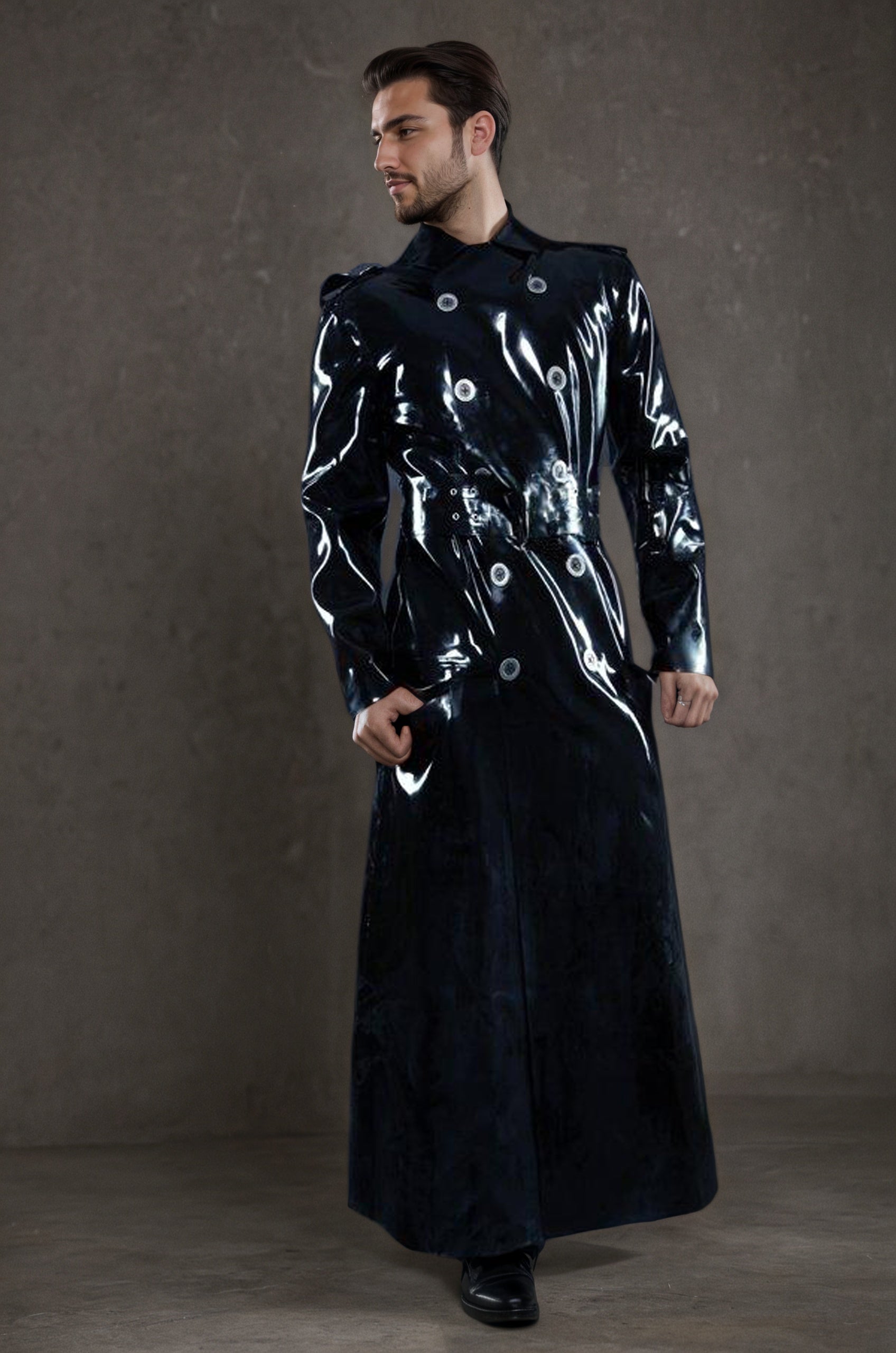 This imposing full-length trench coat is made from high-gloss black latex. Its surface is incredibly smooth and intensely reflective, brilliantly catching surrounding light. This creates prominent highlights and a distinct "wet-look" sheen, a hallmark of latex that makes the garment truly eye-catching.