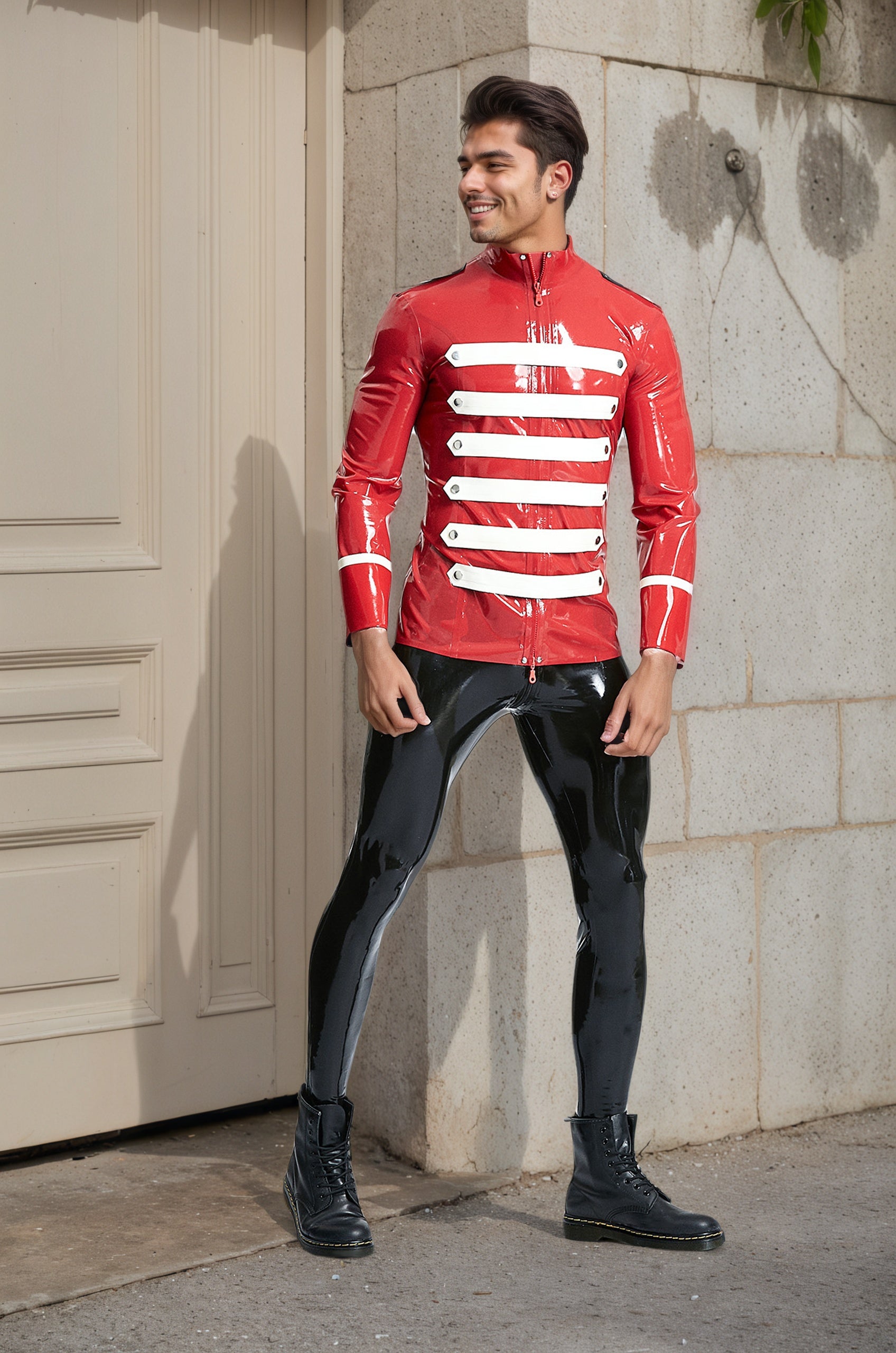 Overall Impression: This red and white latex jacket is incredibly bold and meticulously detailed. Its vibrant colors, military-inspired design, and high-gloss finish create a powerful and show-stopping look, perfect for themed events, performances, or making a strong fashion statement.