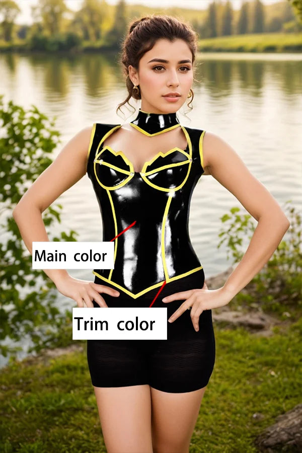 The "Fangora" Concept Meticulously crafted from premium 1.0 mm natural latex, the "Fangora" boasts a luxurious weight and a mirror-like shine. The rich black base serves as the perfect canvas for the kinetic yellow trim, which outlines the garment’s structure with graphic precision. This unique styling accentuates the body’s natural curves while adding a futuristic, comic-book-inspired flair. The elegance of the halter neck combined with the daring frontal cut-out ensures a look that is both avant-garde and timelessly provocative.