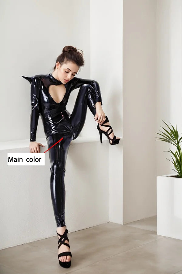 One-piece high-neck long-sleeved latex catsuit with structural shoulders.