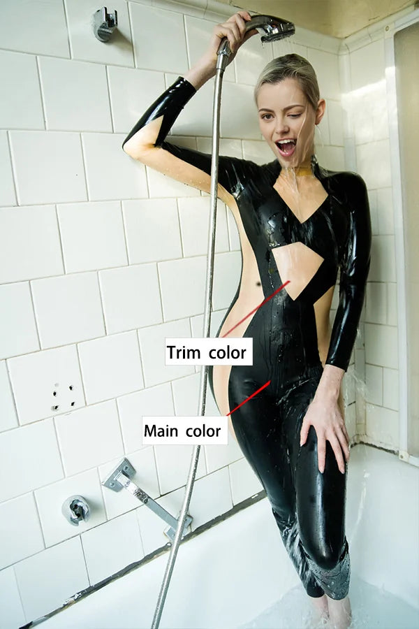Material & Gloss: Step into a masterpiece of avant-garde fashion with this high-gloss natural latex catsuit. The deep, solid black panels contrast sharply with the delicate Translucent Nude sections, creating a sophisticated play on light and skin. The ultra-smooth, reflective surface provides a classic "wet-look" shine that emphasizes the garment’s intricate construction and daring color-blocking.