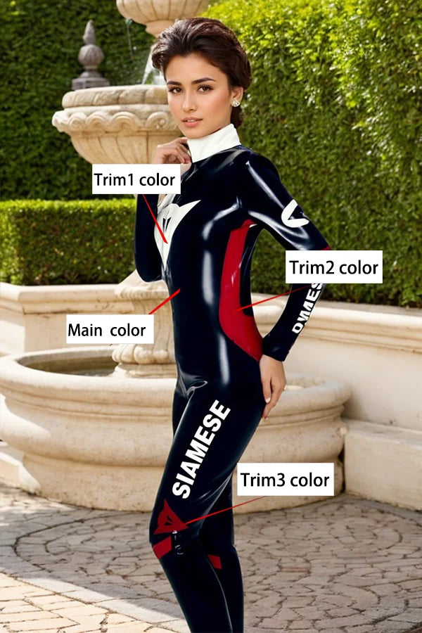 Material & Gloss: Embrace a high-octane aesthetic with this professional-grade racing catsuit. Crafted from premium 0.40 mm natural latex, the garment features a deep black base polished to a mirror-like "wet-look" shine. This smooth, high-refractive surface emphasizes the vibrant color-blocking, delivering a sleek, modern look that bridges the gap between high fashion and sportswear.