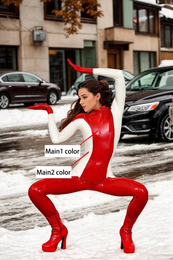 Material & Gloss: Channel your inner star with the "Quentin's Favorite" catsuit. Crafted from premium 0.40 mm high-gloss natural latex, this stunning piece features a high-impact contrast between fiery red and clinical white. The material’s superior reflective properties amplify the dynamic dual-tone design, creating a high-energy, cinematic look that captures every light.