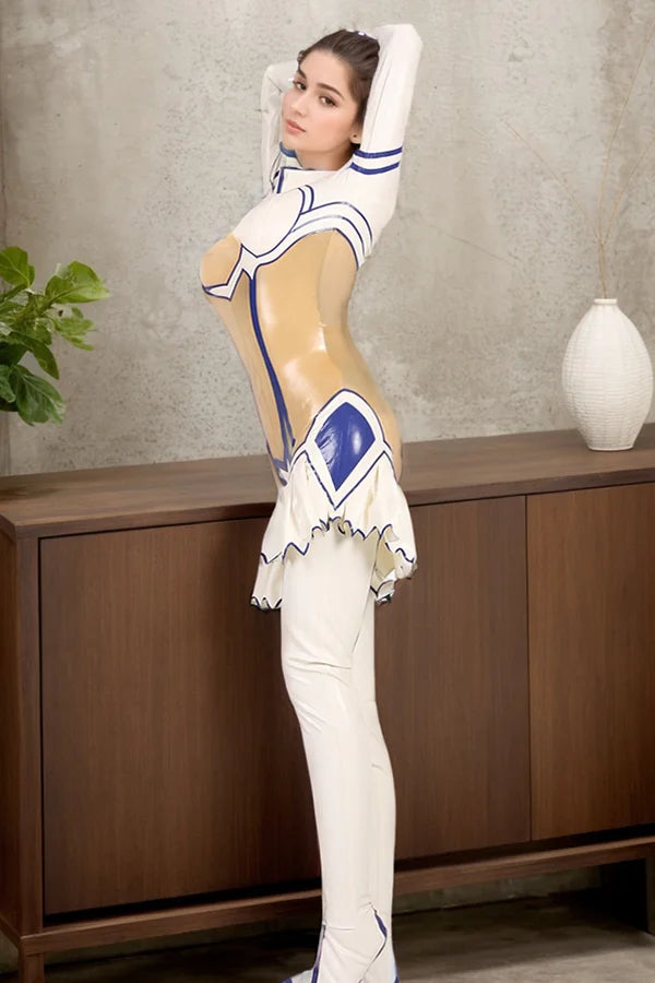 The "Astra-Cute" is engineered with precision tailoring to provide an impeccable "second-skin" fit. The natural elasticity of the latex works in tandem with the strategic paneling to sculpt and celebrate your natural curves. The combination of opaque white, sheer nude, and structural blue trims results in a silhouette that is fluid, powerful, and utterly unique.