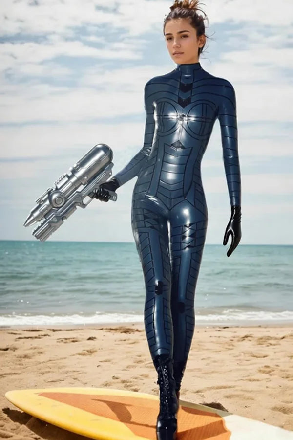 Material & Gloss: Immerse yourself in a high-definition, cybernetic aesthetic. Crafted from premium 0.40 mm natural latex, the suit is rendered in a breathtaking Metallic Peacock Blue. This specialized pigment offers an intense, deep-sea luster that, when polished to a professional mirror-shine, creates a vibrant "wet-look" finish that looks like liquid metal flowing over the body.