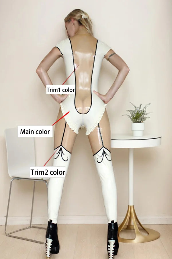 Achieve a look of sharp, clinical elegance with the "Architect" catsuit. This striking piece is crafted from premium 0.40 mm high-gloss white latex, providing a brilliant, reflective surface that radiates modern sophistication. The design uses high-contrast black linework to create a structured, "2D-effect" aesthetic that is both bold and minimalist.