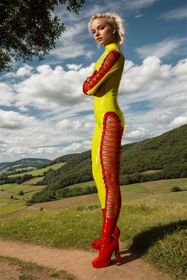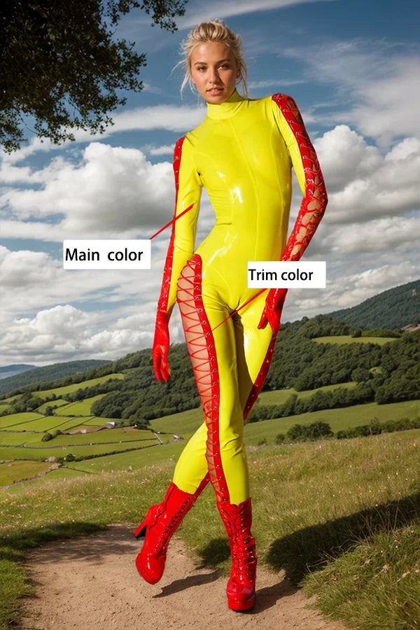 Material & Gloss: Command the spotlight in this high-voltage ensemble. Crafted from premium 0.40 mm natural latex, the brilliant yellow base is polished to a glass-like finish. Its superior reflective properties create a vibrant, radiant "wet-look" shine that makes this garment exceptionally eye-catching. The contrasting bright red trims and laces add a fierce, high-energy pop to the overall aesthetic.