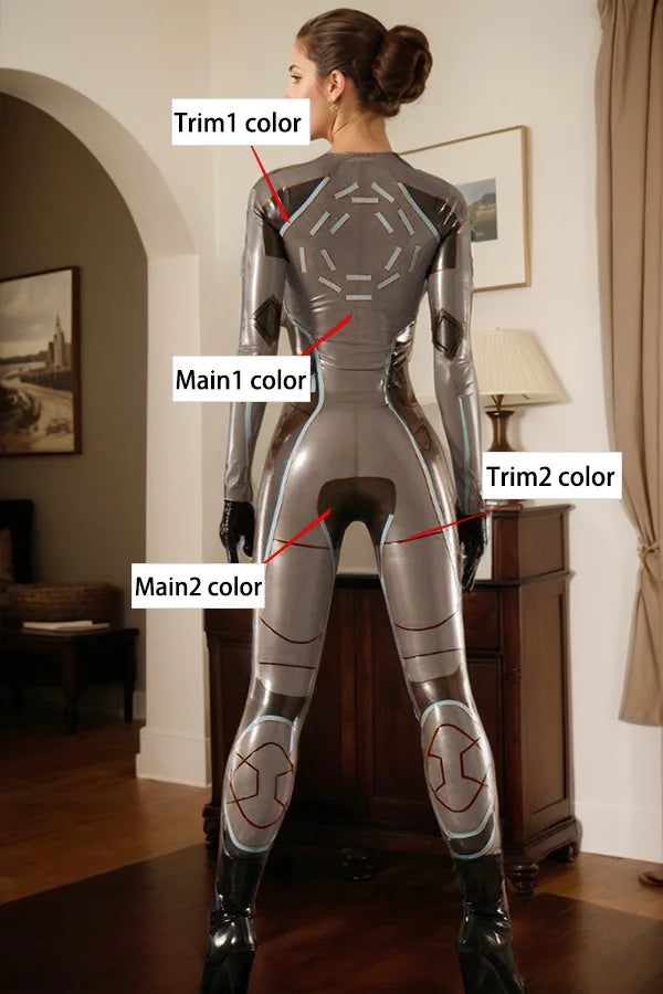 Material & Gloss: Step into the digital frontier with the "Tron Lady" latex catsuit. Crafted from premium 0.40 mm high-gloss natural latex, this garment features a striking base of liquid Metallic Silver. The brilliant, reflective quality of the silver latex is paired with deep black and crisp white accents, creating a high-refractive "wet-look" finish that radiates a powerful, futuristic energy.