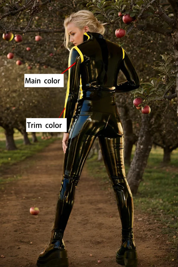 Fit & Appearance: The 0.8mm material provides a formidable, sculpted look that holds its shape better than standard thin latex. The one-way front zipper runs from the high collar to the hem for easy entry. When polished, the black and yellow surfaces achieve a deep, industrial-grade shine that commands attention.