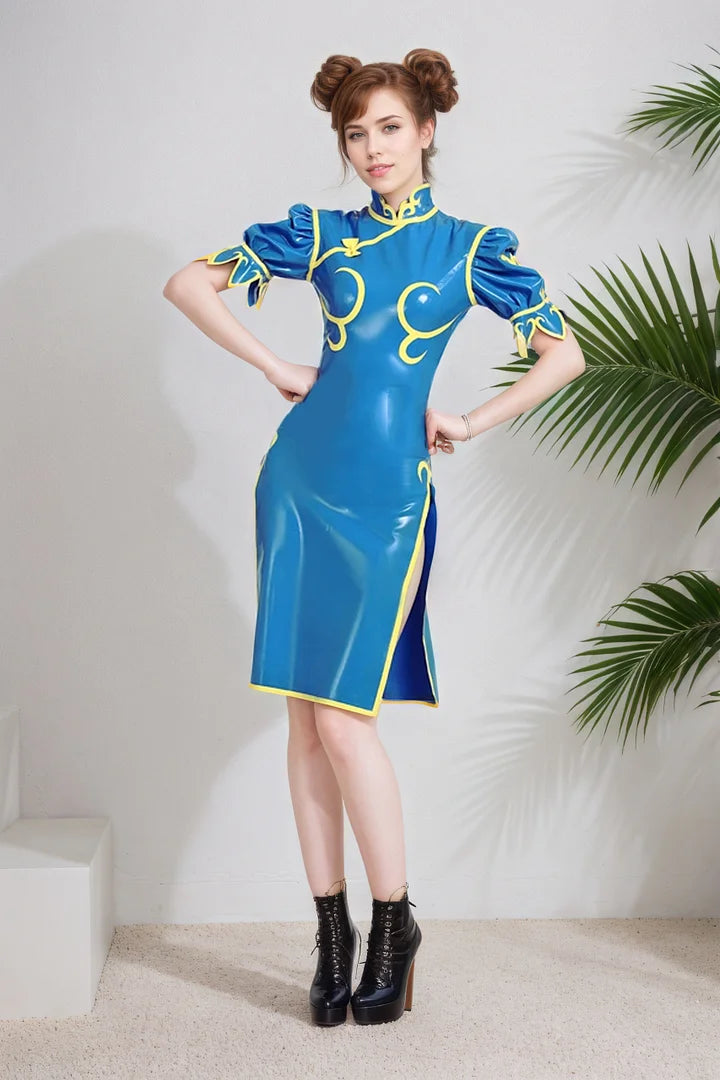 This vibrant and iconic latex dress is directly inspired by the classic costume of Chun-Li from the popular fighting game. Designed for cosplay events and themed parties, it perfectly blends the recognizable character aesthetic with the unique allure of latex.