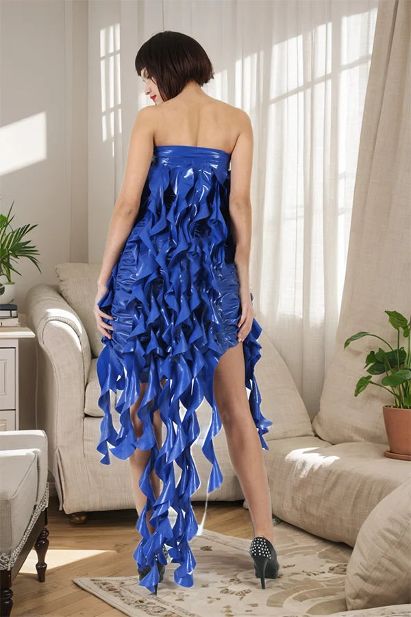 Material and Design: The "In A Twist" latex cocktail dress is meticulously crafted from high-quality, high-gloss 0.40 mm natural latex. The main body is a vivid royal blue, providing a powerful canvas for the garment's intricate design. The focus of this piece is its sculptural quality, using ruching, drawstrings, and strategic cutouts to manipulate the latex into an artistic, asymmetrical, multi-wearable silhouette.