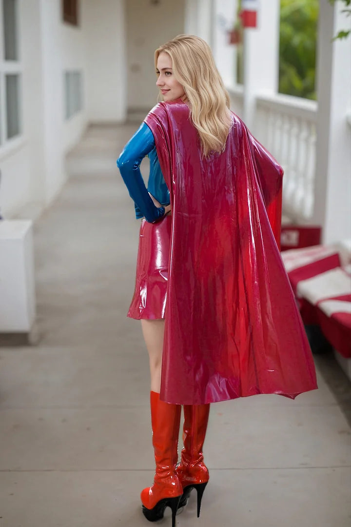 Material and Design: This "Super-Girl" inspired garment is meticulously crafted from high-quality, high-gloss 0.40 mm natural latex. The design is a clever interpretation of a classic heroic uniform, blending familiar fantasy aesthetics with the high-shine, body-con nature of latex. An invisible zipper down the back ensures a smooth, seamless fit.
