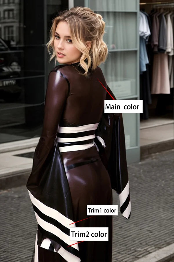 Open-Front Tunic Silhouette: In a unique twist on traditional dress design, the front hem is left open (skirtless front). This high-fashion tunic cut is engineered specifically to be paired with latex leggings or trousers, creating a dynamic, multi-layered look.