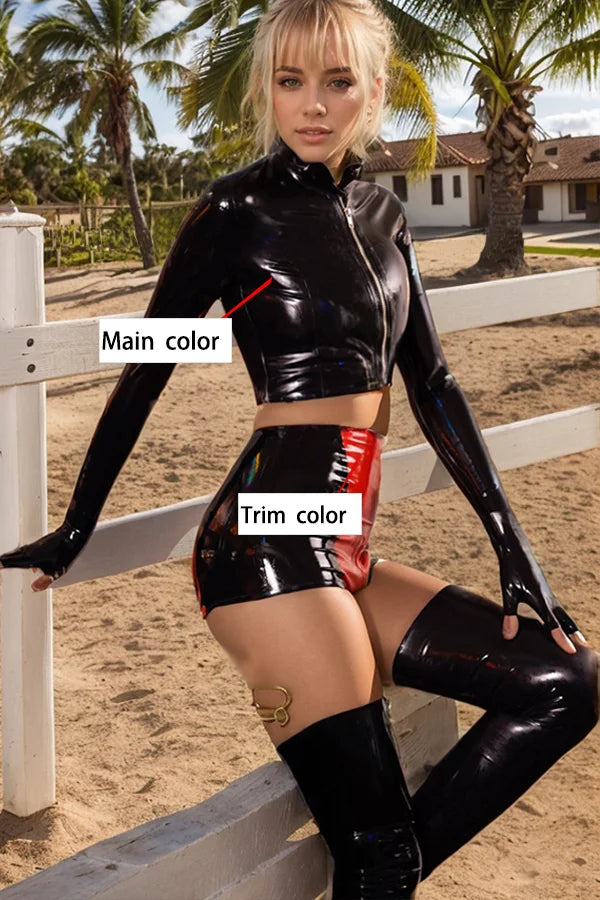 Note: This listing includes the Latex Crop Jacket only. The shorts, gloves, and stockings shown in the images are for styling purposes and are available for separate purchase via email inquiry.