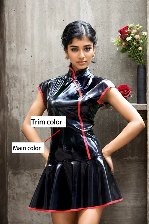 Qipao Inspired: This mini dress is inspired by the traditional Chinese Qipao (Cheongsam), reinterpreted in high-gloss latex. It features a standing Mandarin collar, short sleeves, and a pleated mini skirt.