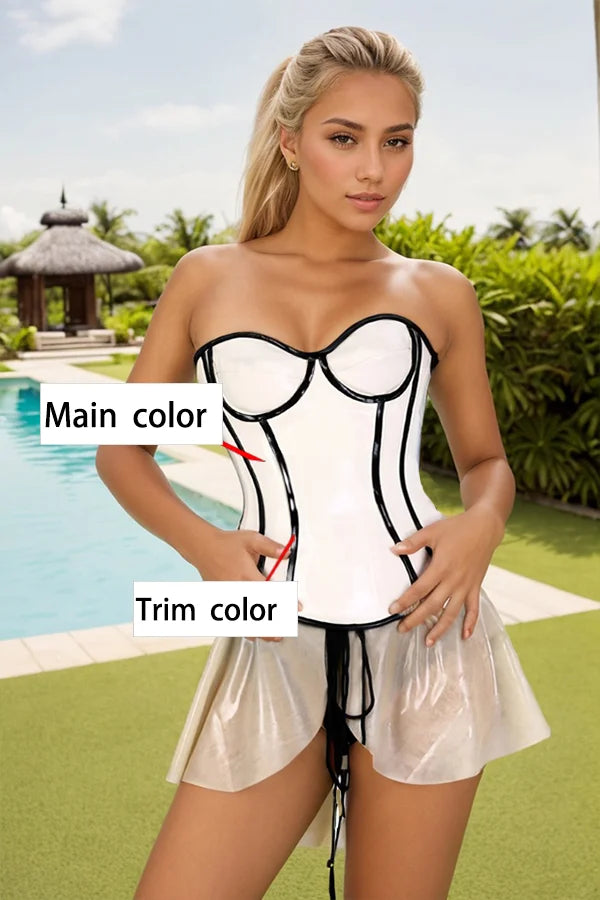 The "B Mine" Concept The "B Mine" corset is meticulously crafted from premium high-gloss white latex, serving as a clean canvas for the intricate black detailing. The vertical "contour" lines not only add a modern pop-art flair but also visually elongate the torso and slim the waist. This unique combination of a high-shine finish and graphic detailing makes the garment appear as if it were stepped out of a high-fashion sketch or a stylized comic book.